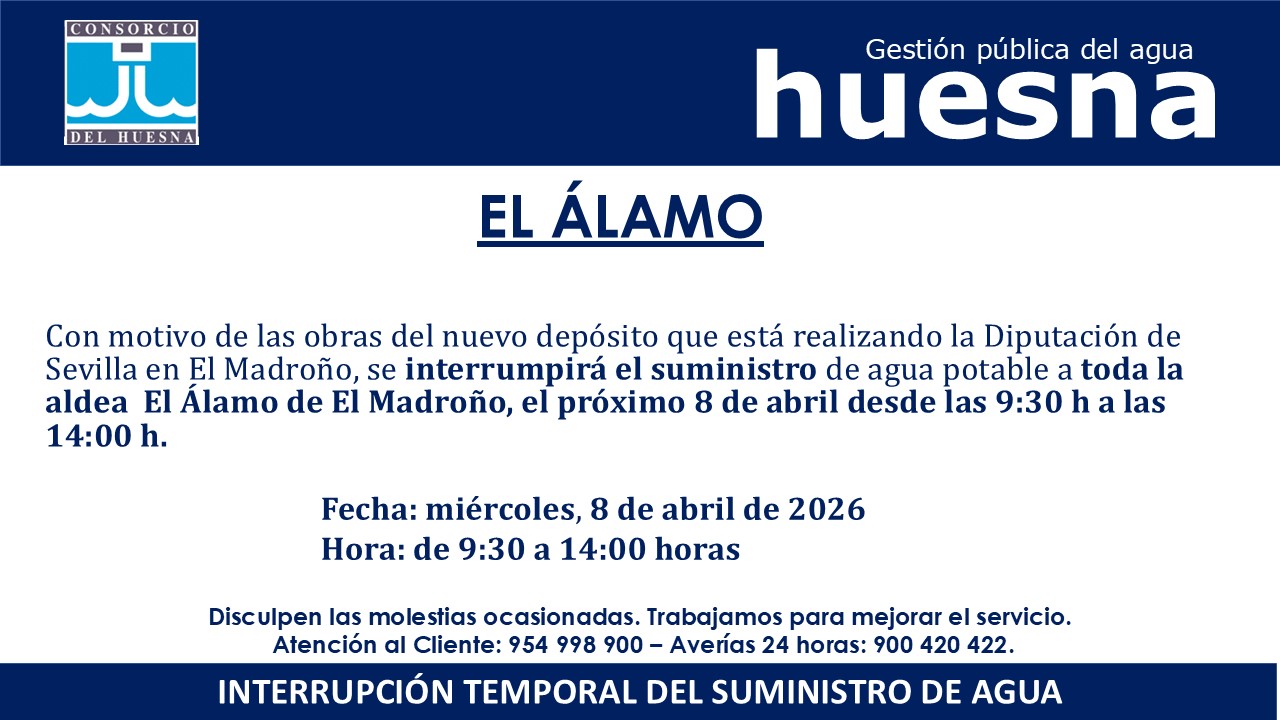 Con motivo de las obras del nuevo depósito que está realizando la Diputación de Sevilla en El Madroño, se interrumpirá el suministro de agua potable a toda la aldea El Álamo de El Madroño, el próximo 8 de abril desde las 9:30 h a las 14:00 h.