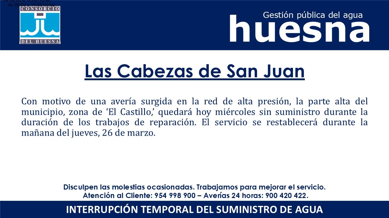 Con motivo de una avería surgida en la red de alta presión, la parte alta de Las Cabezas de San Juan, zona de ‘El Castillo,’ quedará hoy miércoles sin suministro durante la duración de los trabajos de reparación. El servicio se restablecerá durante la mañana del jueves, 26 de marzo.